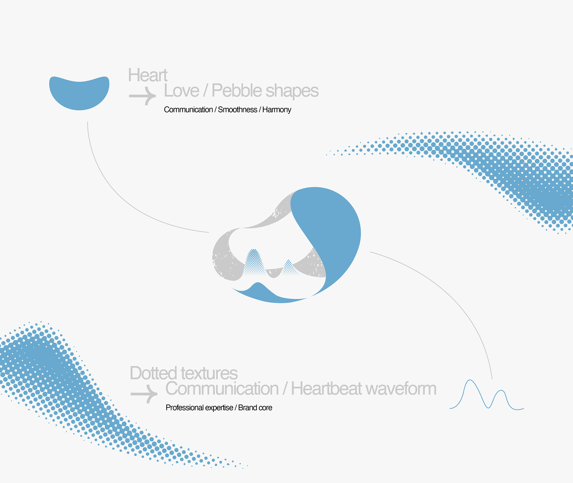 The visual identity centers on the heart, translated into a smooth, pebble-like form that represents protection, care, and long-term companionship. Dotted patterns abstract cardiology waveforms, suggesting continuous observation and precision. Blue is used as the primary color to convey calmness, rationality, and medical reliability.