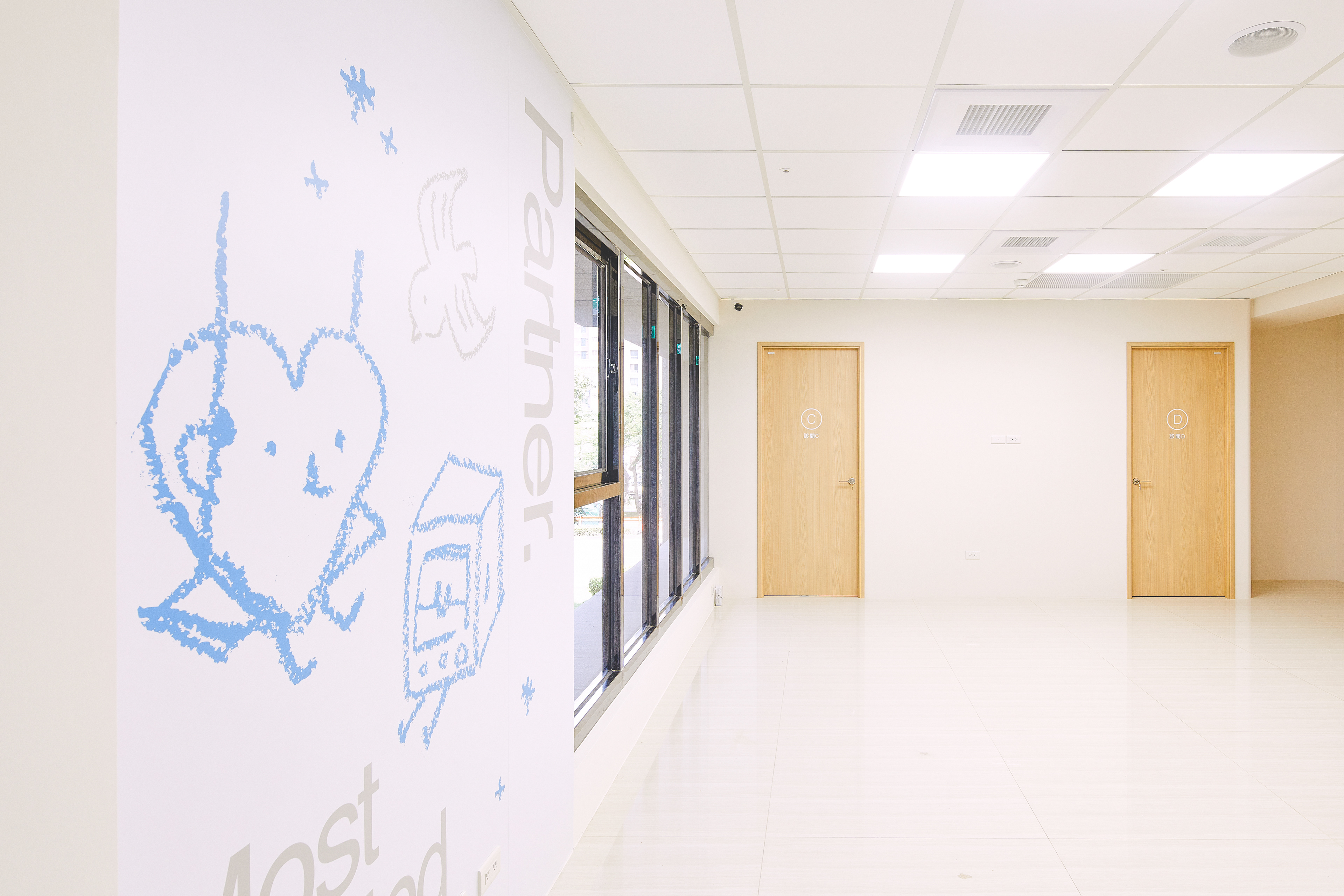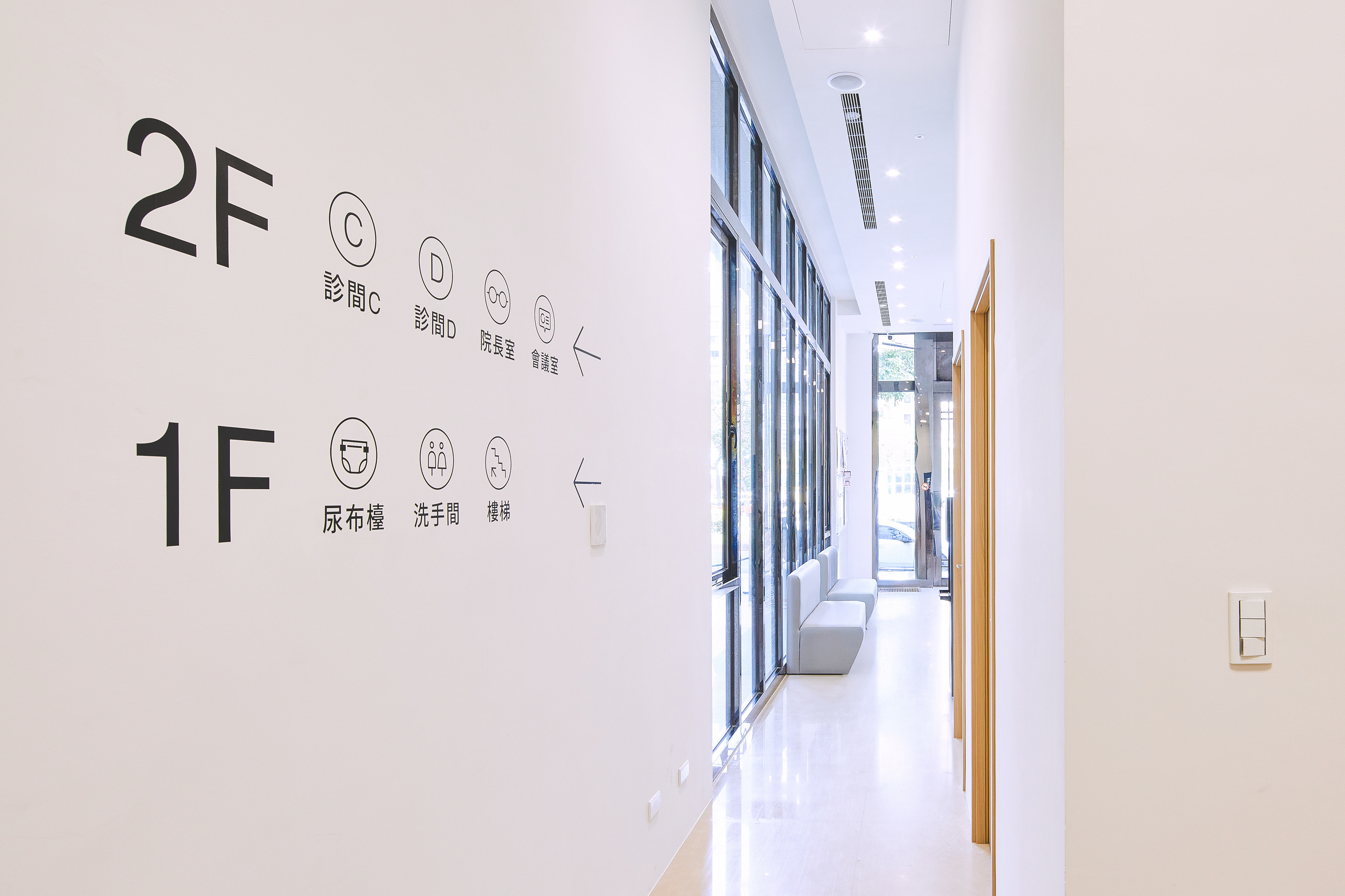 空間與指標系統被視為品牌體驗的重要一環,規劃上以女性與兒童為主要使用者,重新檢視視線高度、閱讀距離與資訊密度,使動線與指引在潛意識層面即能被理解。同時,兒童導向的識別元素被有意識地融入空間設計之中,避免過度卡通化,轉而以節制、溫潤的方式,與侘寂所強調的自然、不張揚與時間感形成呼應。